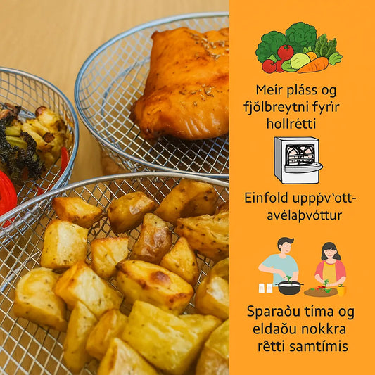 Fjölhæft Stálkorbasett fyrir Loftsteikingarofn – 3 Korb, 2 Klípur & Uppskriftabók