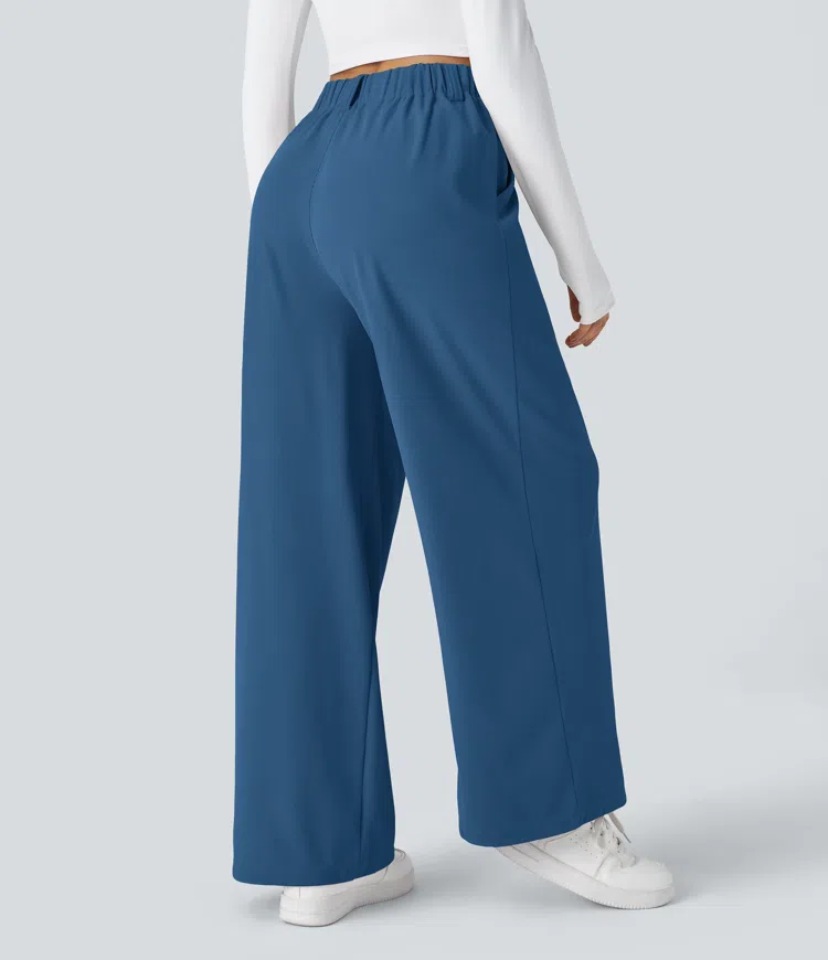 Plíseraðar teygjanlegar buxur með háu mitti,...